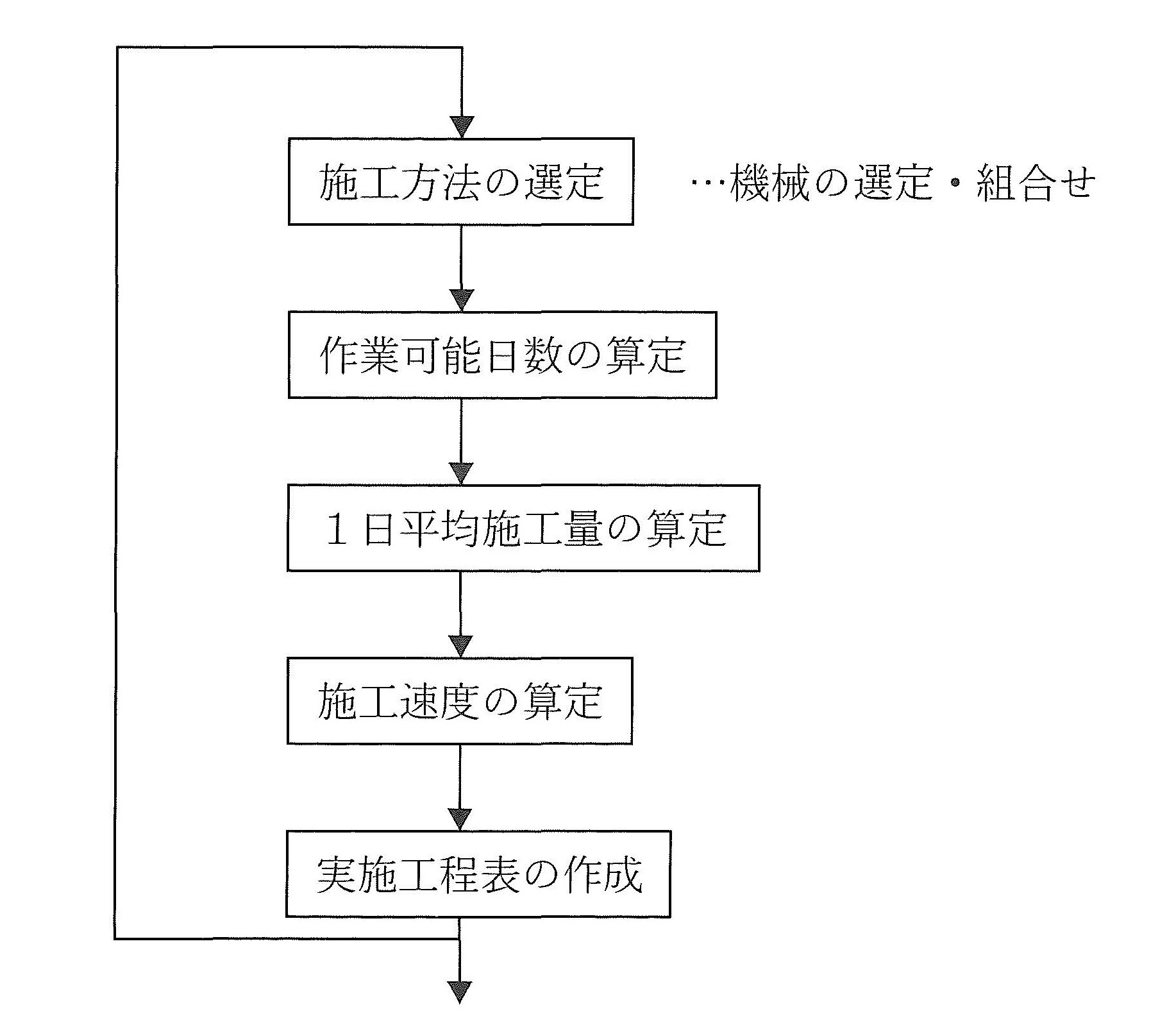 などの工事条件に適した機種・容量の建設機械について検討し、機種をしぼり、その数種の機種について経済性と合理的組合せを検討する。