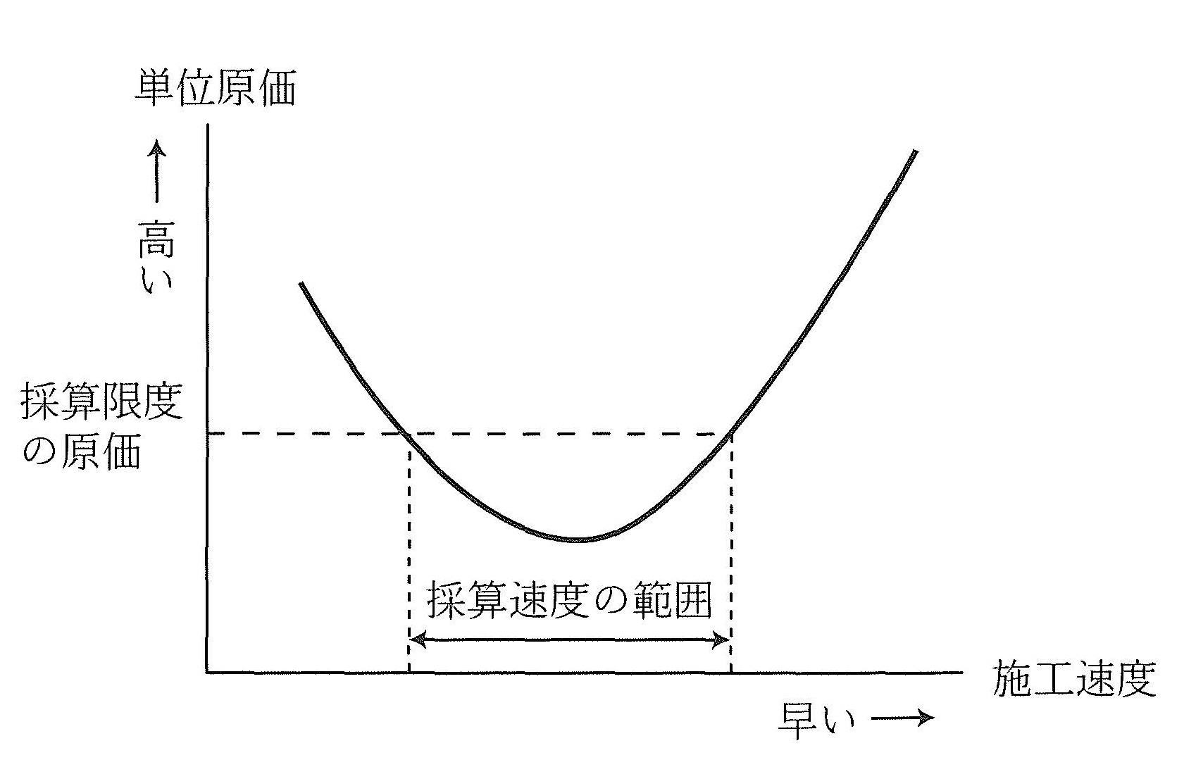 施工速度が遅いと施工効率が悪く単位あたりの原価は高いが、施工速度を速めると出来高が増加して単位原価は低減する。さらに、ある限度を超えて施工速度を速めようとすると、機械の大型化や高価な資材の使用が必要となり、単位原価は上昇する。単位原価の上昇が著しい例は、突貫工事である。