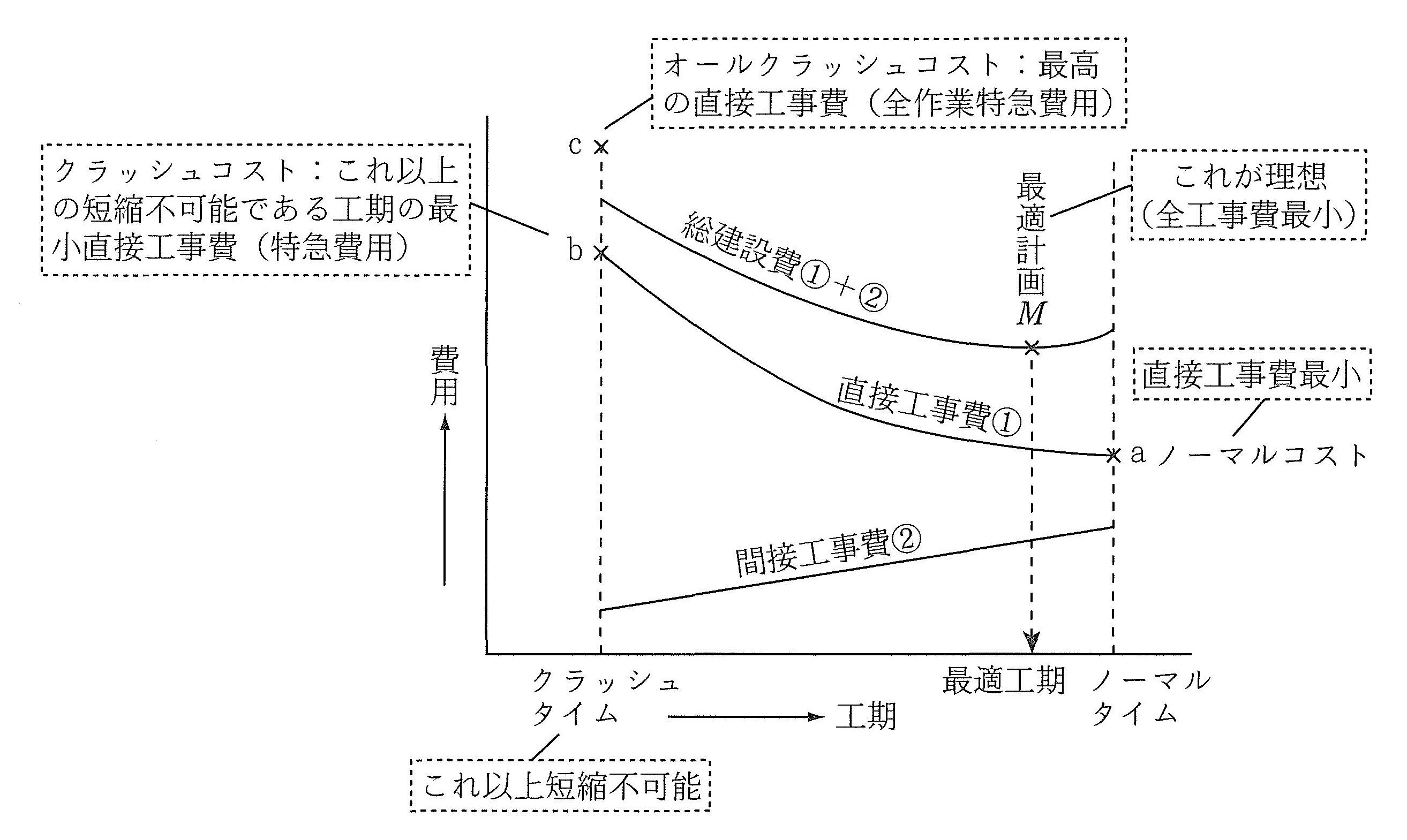 最適工期とは、建設費のうち、直接工事費と間接工事費の合計金額が最も経済的となる工期である。