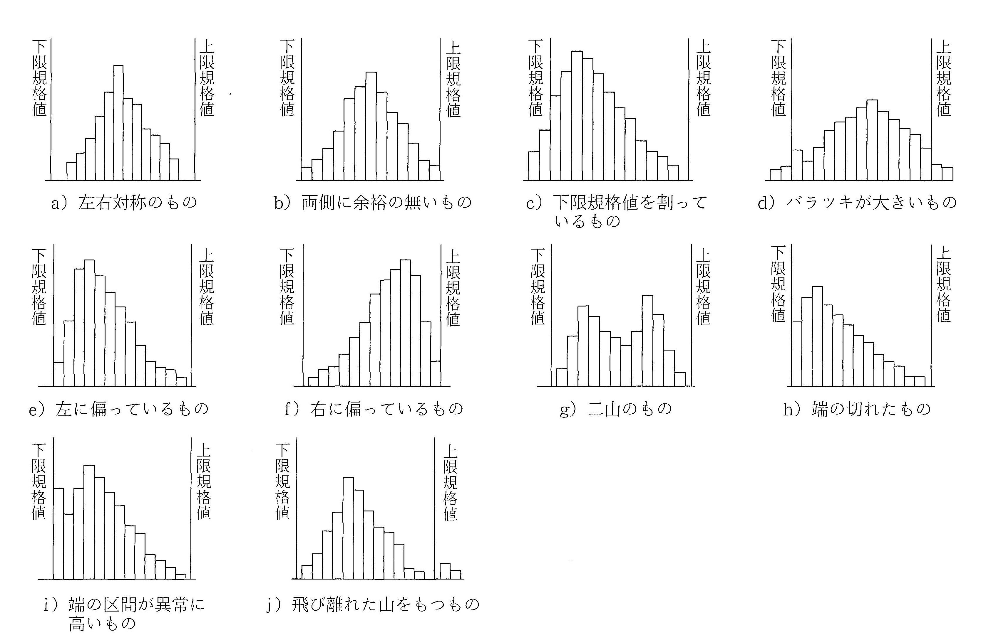 測定値のヒストグラムは、一般に、中心付近が最も高く、中心から離れるほど低くなる左右対称のつり鐘型を示すことが多いが、実際には、種々の要因によっていろいろな形状のものが生まれる。