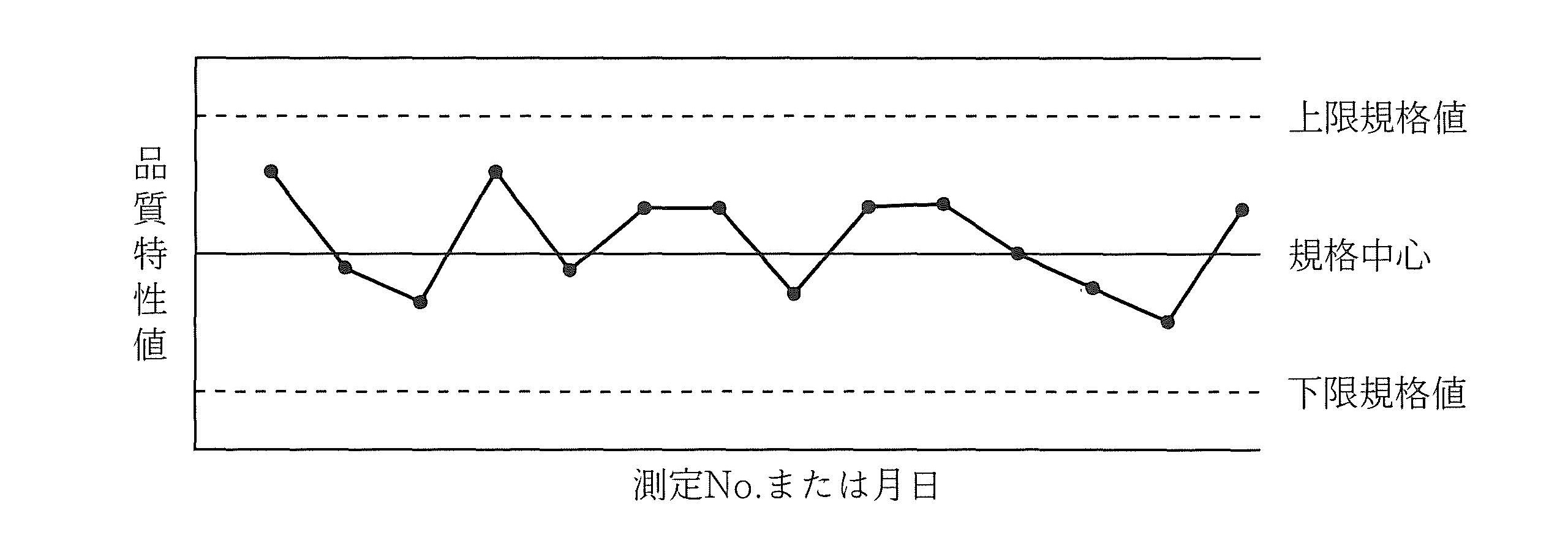 工程能力図は、グラフ用紙の横軸に測定No.または月日を、縦軸に品質特性値を目盛り、上下限規格値を示す線を引く。各データは、そのまま測定した順序に1点ずつ打点し、各点を実線で結ぶ。