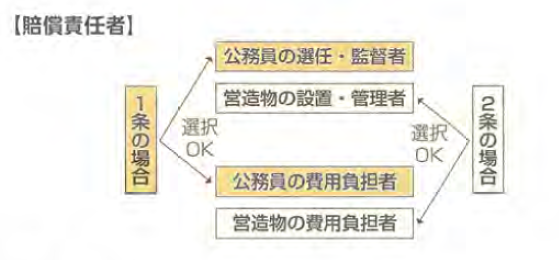 国家賠償法 1 条の場合、公務員を選任・監督している国や公共団体が、国家賠償法 2 条の場合、公の営造物を設置・管理している国や公共団体が、それぞれ国家賠償責任を負うのが通常です。