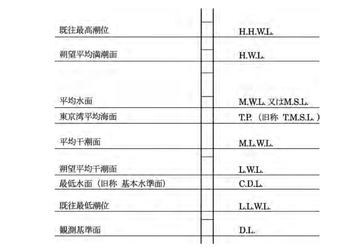 なお、漁港の施設には、集落道、漁港関連道等のように陸上に設置される構造物もあることから、東京湾平均海面(T.P.)と工事用基準面との関係を明らかにしておく必要がある。さらに、場所によっては地震等による急激な地盤変動や地下水汲み取り等による長期間にわたる地盤高の変化があることから、常に地盤の高さについては注意を払う必要がある。