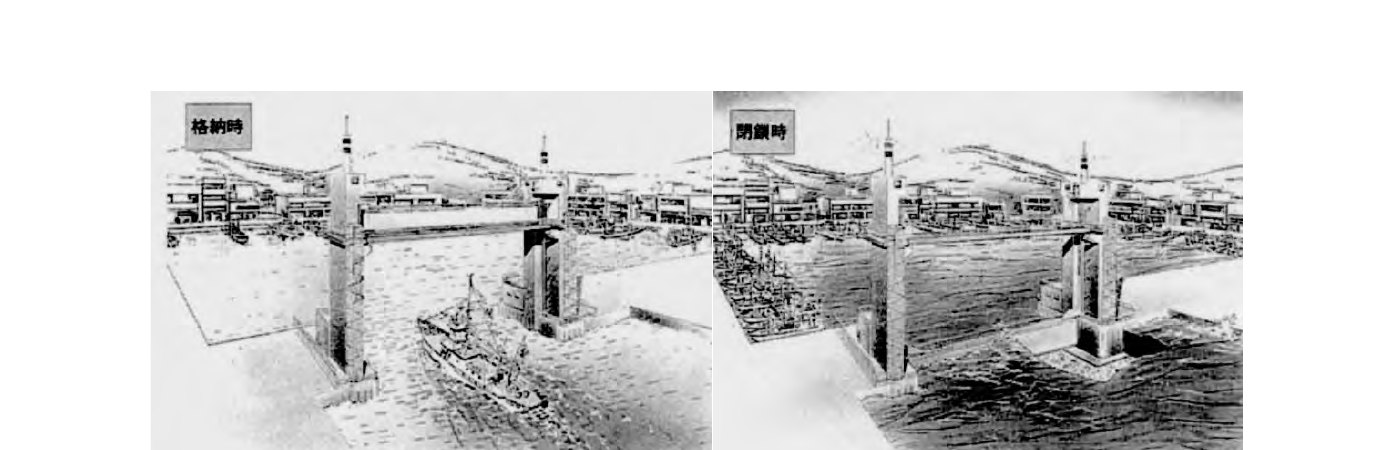 等がある。⑤の場合、漁港における漁船等の利用形態や背後施設の重要度等を検討するとともに、これまで行われてきた対策との機能性や経済性の比較を行う必要がある。この構造型式としては、ローラーゲート式、起伏ゲート式、膜式(水圧により膜を膨張させて閉鎖する方式)等があるが、図 2-2-4 にローラーゲート式の概略図を示す。