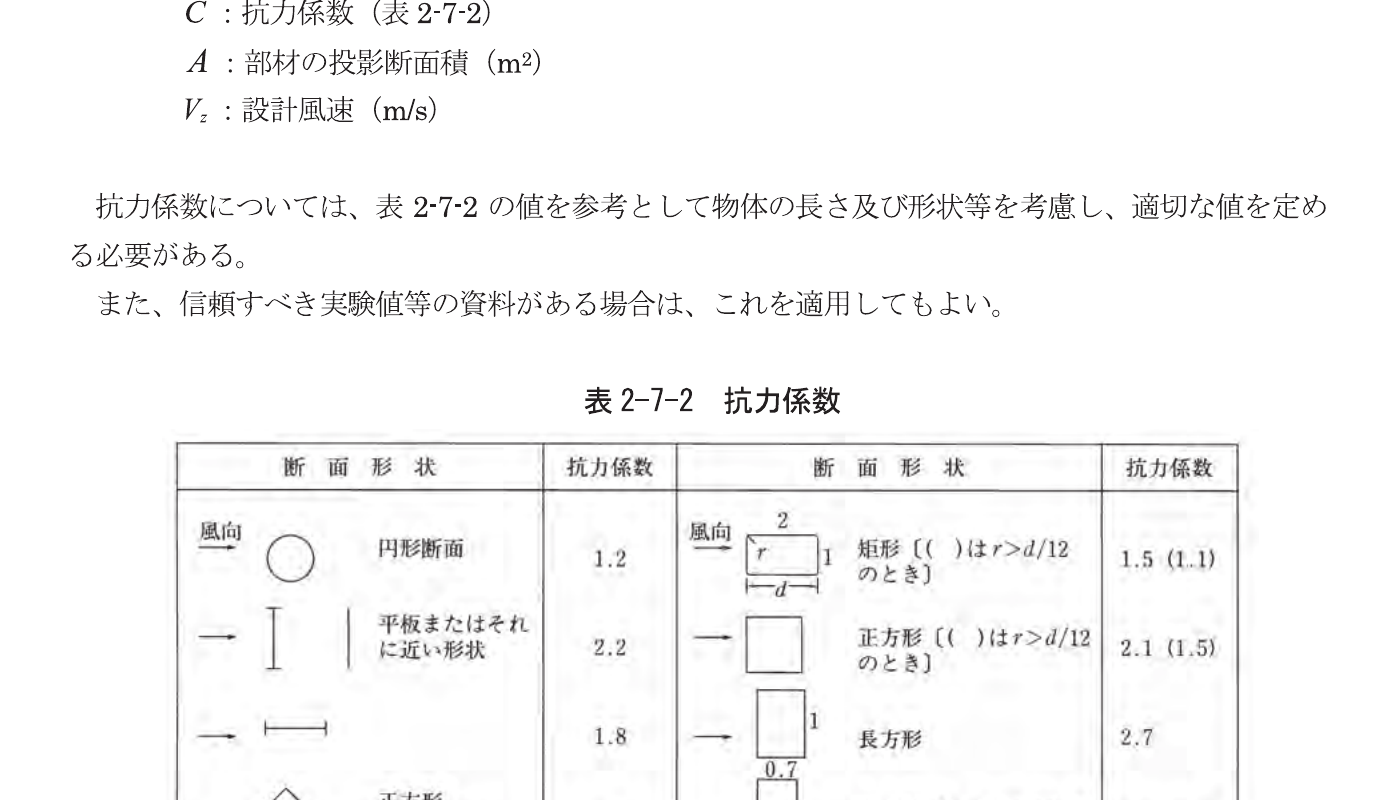ここに、: 風圧力(N)、: 空気の密度(1.25kg/m³)、: 抗力係数、: 部材の投影断面積(m²)、: 設計風速(m/s)