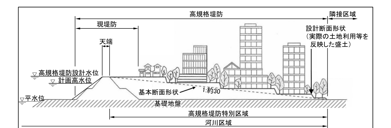なお、高規格堤防特別区域には、住宅・ビル、工場、道路、公園、農地としての利用等、通常の土地利用に供されることから、通常の市街地と同程度の安全を確保するべきである。このため、治水上求められる機能に加え土地利用の観点からも必要な機能を有する構造物として、共同事業者等と十分な調整を行い、適切な役割分担のもと、設計するものとする。