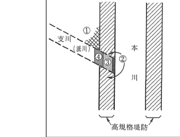 本川と支派川に囲まれたくさび状の高規格堤防部分が諸荷重に対して弱点箇所とならないかどうかの検討、必要に応じて対策を講じることが考えられる。