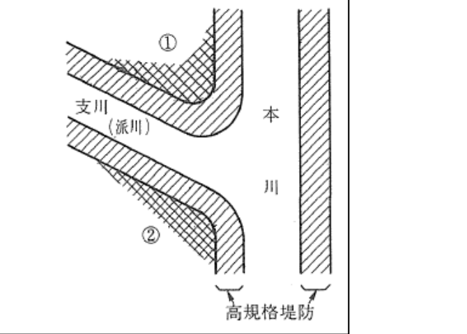 タイプⅡ:支川が自己流を持って合流する場合や支川堤防がバック堤である場合、自然分流である場合等、洪水時に本川と支派川の水位が等しい。