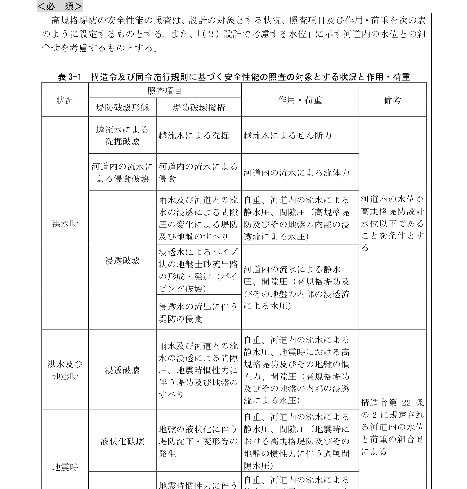 高規格堤防の設計に当たっては、構造令第22条の2、第22条の3に従い、表 3-1 に示す状況と照査項目に応じて想定する水位及び作用・荷重とその組合せを設定する必要がある。なお、「洪水及び地震時」と「地震時」に考慮する作用・荷重と河道内の水位との組合せについては、「3.5.2(3)浸透破壊に対する安全性 1)すべり破壊に対する安全性」(表 3-3)、「3.5.2(4)地震時の液状化破壊・すべり破壊に対する安全性 1)構造令施行規則に規定される設計震度に対する安全性」(表 3-4、表 3-5)に示している。