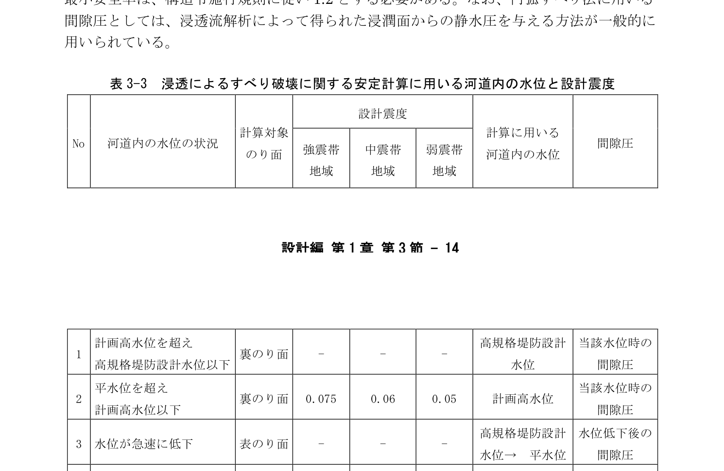 | 裏のり面 | 0.15 | 0.12 | 河道内の水位における | |