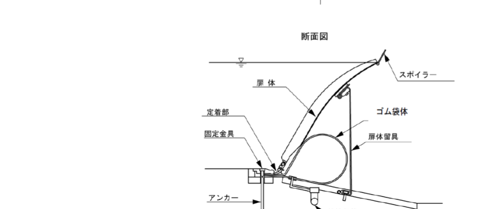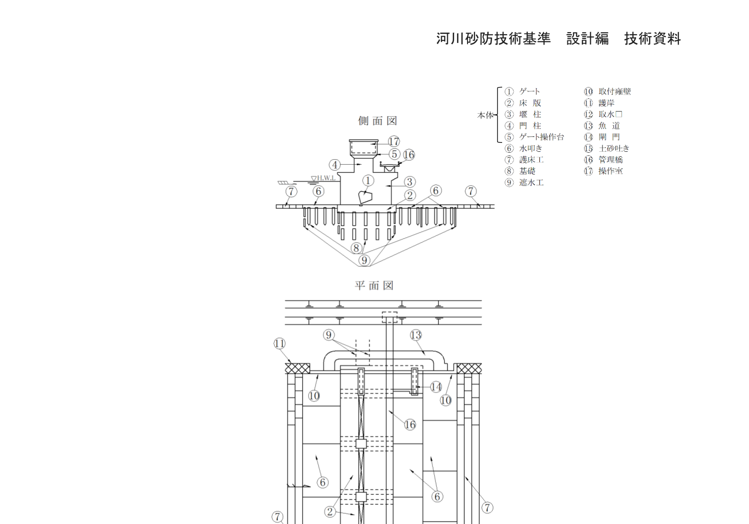 引上げ式ゲートを有する可動堰の各部位の名称は図7-1による。 固定堰の各部位の名称は図7-2による。