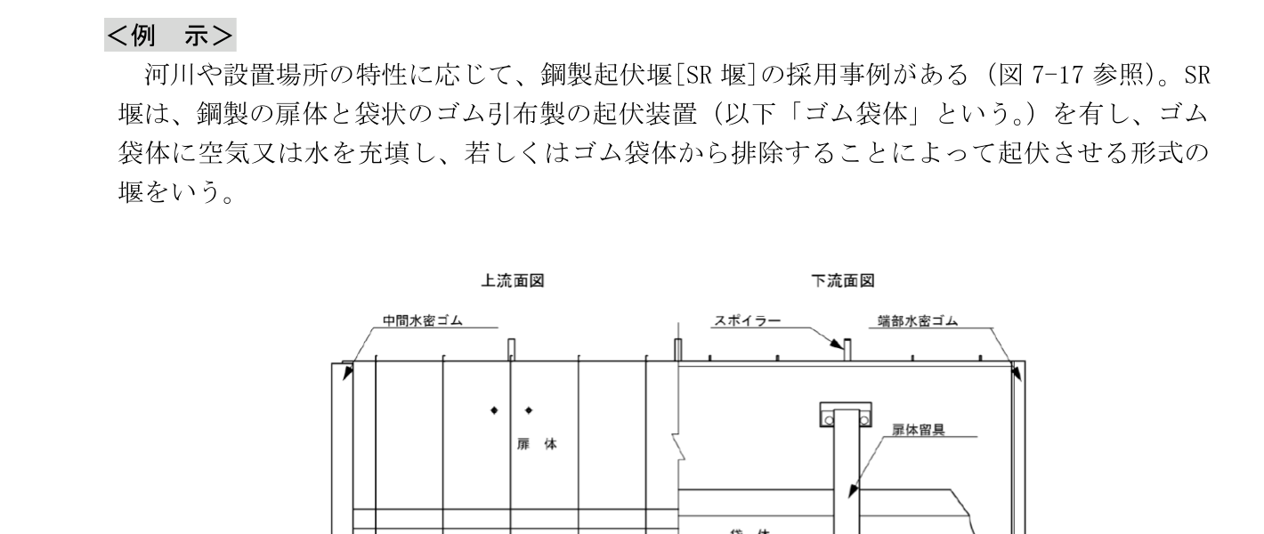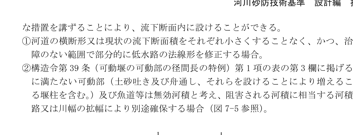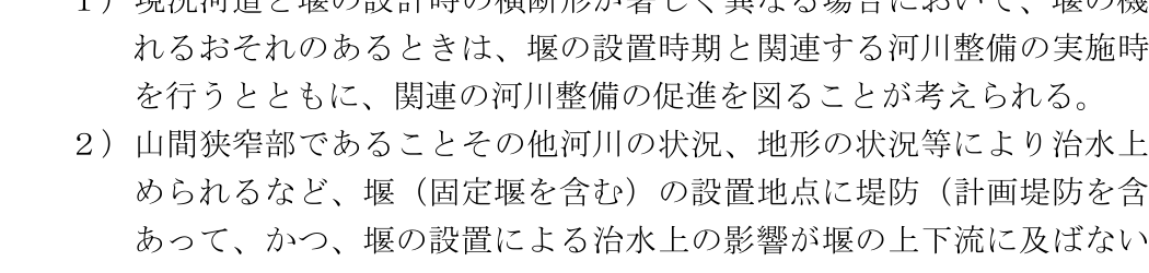- 山間狭窄部であることその他河川の状況、地形の状況等により治水上の支障がないと認められるなど、堰(固定堰を含む。)の設置地点に堤防(計画堤防を含む。)がない場合であり、堰の設置による治水上の影響が堰の上下流に及ばない場合には、治水上の機能の確保のため適切と認められる措置を講ずることにより、流水を流下させるためのゲート及びこれを支持する堰柱等の可動部以外の部分及び固定堰は、流下断面内に設けることができる。流水への影響が小さく、上流への影響がない場合は、土砂吐き、舟通し、魚道、固定部又は固定堰等を流下断面内に設けることができる。