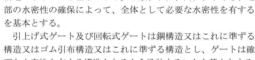 ゲートは、確実に開閉(起伏)し、かつ、必要な水密性及び耐久性を有する構造が求められる。開閉装置は、ゲートの開閉(起伏)を確実にできる構造が求められる。また、常用電源が喪失した場合に備え、予備電源や予備動力、補助開閉装置を設けるなど、ゲートの開閉に必要な機能を維持することが求められる。なお、地域特性に応じて、自動化、遠方操作化や遠隔操作化を検討する。