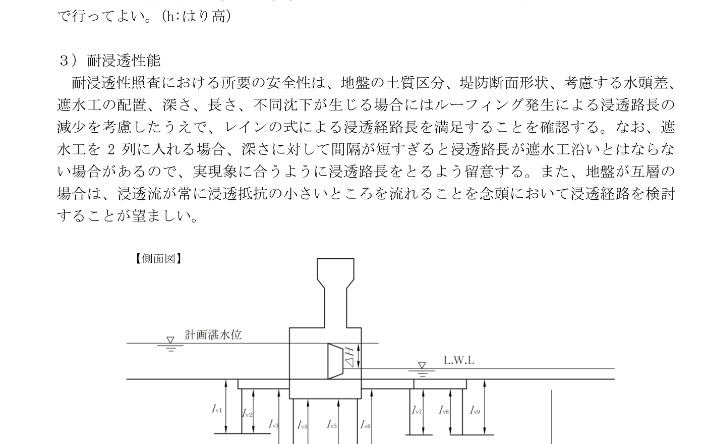 遮水工は、堰上下流の水位差によって生じる浸透水の動水勾配を減少させ、堰下部の土砂の流動及び土砂の吸出しを防止するため、適切な位置に設けることを基本とする。遮水工の構造は、原則としてコンクリート構造のカットオフ又は鋼矢板構造とし、遮水工の深さ、水平方向の長さは、堤防断面形状、水頭差、浸透経路長、過去の事例などを総合的に検討の上で決定することを基本とする。