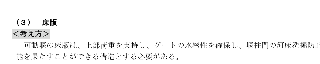 水叩きは、堰の安全を保ち、上下流河床と本体部分の粗度の違い又はゲート開放時の流水等によって河床が洗掘されるのを防止する必要な長さと構造を有する必要がある。水叩きの設計に当たっては、構造や材料の特性に応じた設計手法を適用しモデル化を行い、最も不利な断面力が生じる作用に対して、安全性が確保される必要がある。また、水叩きと床版の継手部は、吸出し防止を目的とし、水密性を確保する必要がある。