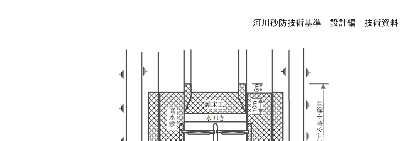 - 水叩きと護床工を含めた長さは、必要に応じて、水理計算、水理模型実験、河床材料、河道形状(単、複断面)、河床勾配、堰の全幅、揚圧力に対する安定条件、遮水形状等についての検討結果及び過去の事例等を参考として総合的に判断して決定する。