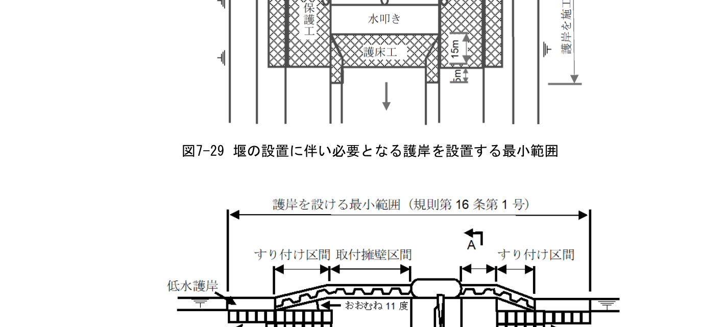 洪水時には河床そのものが動いており、堰の設置によってその連続性が失われるので、堰の上下流において射流の有無にかかわらず局所的な洗掘が生じやすい。このため、堰の上下流の河岸又は堤防には、しかるべき範囲に護岸を設ける必要がある。その範囲は、上流側は堰の上流端から10mの地点又は護床工の上流端から5mの地点のうちいずれか上流側の地点、下流側の水叩きの下流端から15mの地点又は護床工の下流端から5mの地点のうちいずれか下流側の地点までの範囲を最低限として設ける必要がある(図7-29参照)。