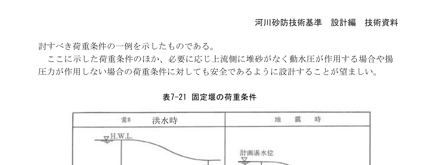 堰は「7.2 機能」に示す事項を満足すると共に、想定される外力に対して安全な構造となるよう設計する必要がある。