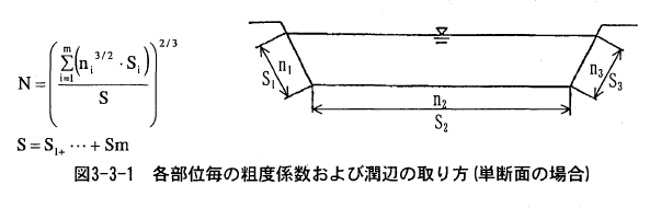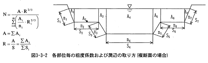 複断面河道の場合は、低水路、高水敷、護岸部に分けて粗度係数を設定しこれらを合成して求める。この式は、分割した断面間での流れの干渉(せん断力)を無視し、それぞれの断面で独立して流れが生じていると仮定して導かれたものである。