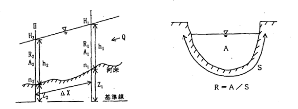 近似的に流れが等流と見なせる場合、以下に示す摩擦損失のみを考慮したマニングの平均流速公式と連続式を用いて水位を算定する。