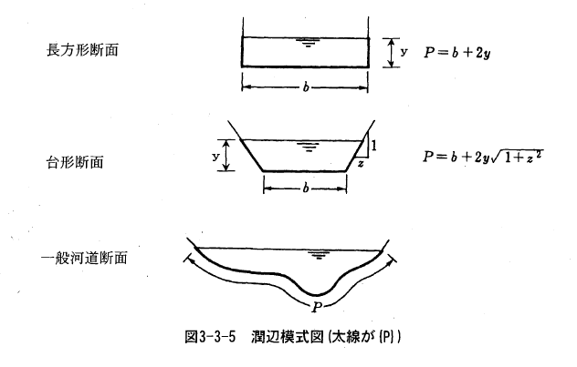 また、径深は潤辺長(m)を用いて次式で算定する。