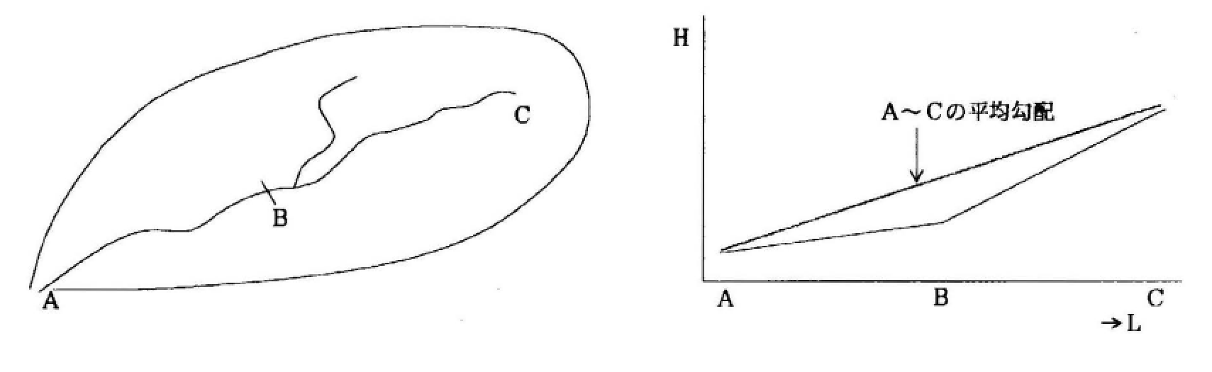 A ~ C の平均勾配とすると勾配が全区間 1/100 以上となり流速を過大に見積もる恐れがある。